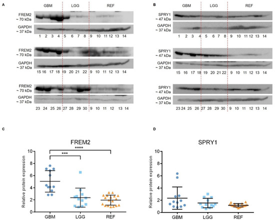 Analysis of FREM2 (A,C) and SPRY1 (B,D) protein expression levels using immunoblotting. Glioblastoma samples (GBM: 1, 2, 3, 4, 15, 16, 17, 18, 23, 24, 25, 26), lower grade glioma samples (LGG: 5, 6, 7, 8, 19, 20, 21, 22, 27, 28, 29, 30) and reference brain samples (REF: 9, 10, hippocampus; 11, 12, periventricular zone; 13, 14, subventricular zone) are shown. (A,B) Representative immunoblots of the proteins of interest. (C,D) Quantification of the immunoblotting. Data are means ± standard deviation, and show significantly higher protein expression levels of FREM2 in GBM versus REF (****, p < 0.0001) and GBM versus LGG (***, p = 0.0009). Significant differences were not observed for SPRY1 expression levels among these analyzed samples.