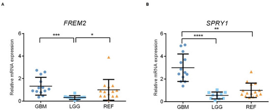Analysis of FREM2 (A) and SPRY1 (B) mRNA levels using qPCR. GBM, glioblastoma; LGG, lower grade glioma; REF, reference brain samples. Data are means ± standard deviation, whereby both FREM2 and SPRY1 show significantly higher expression in GBM versus LGG (***, p = 0.0001; ****, p < 0.0001; respectively). FREM2 was expressed at significantly lower levels in LGG versus REF (*, p = 0.0137), while SPRY1 showed significantly increased expression in GBM versus REF (**, p = 0.0010).