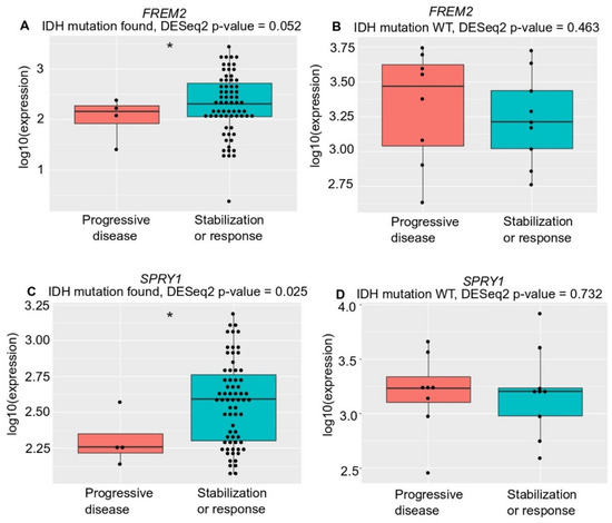 Unexpectedly, although with borderline significance (p = 0.052), there was lower FREM2 expression in LGG patients who progressed during first-line temozolomide treatment and had an IDH mutation versus patients with IDH-mutant stable/responsive disease; whereas there was no difference in IDH-WT patients (Figure 6). We observed the same correlation (with significance now reached; p = 0.025) for SPRY1 expression with treatment outcome in all temozolomide-treated IDH-mutant positive patients—lower SPRY1 expression in temozolomide-treated patients who progressed during first-line temozolomide treatment and had IDH mutation versus patients with IDH-mutant stable/responsive disease (Figure 6C). Additionally, there was no correlation between SPRY1 gene expression and treatment outcome in the IDH-WT patients treated with temozolomide (Figure 6D).