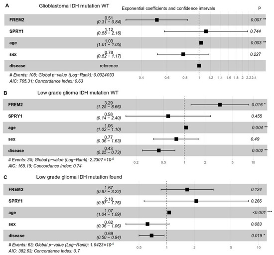 Multivariate survival analysis of overall survival probabilities with respect to FREM2 and SPRY1 gene expression, age, sex, and histological type (disease) in TCGA patients with different IDH mutation status. Exponential coefficients: according to Cox proportional-hazards models, these are scores that indicate possible impact of a given covariate (e.g., FREM2 expression, age, sex) on overall survival. An exponential coefficient >1.0 indicates that the given covariate probably decreases patient survival, whereas coefficients <1.0 indicates increased patient overall survival when this covariate in high. Confidence intervals: 95% for exponential coefficients. Generally, if a confidence interval does not contain the point 1.0, the value of the exponential coefficient is considered significant. P, Cox proportional-hazards p-value for given covariate. (A) Glioblastoma, IDH-WT, 105 patients; (B) Low grade glioma, IDH-WT, 35 patients; (C) Low grade glioma, IDH mutation positive, 63 patients.