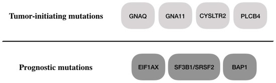 Two layers of mutations in uveal melanoma (UM). Mutations in genes involved in G-protein signaling are present in 98% of samples in a nearly mutually exclusive manner. They are also present in benign choroidal nevi and are therefore thought to occur in the earlier stages of tumor formation. A second layer of mutations occurs in EIF1AX, SF3B1, SRSF2, and BAP1. They are found in 66% of samples in a nearly mutually exclusive manner as well. These mutations confer different prognoses.