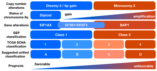 An overview of UM subtypes. Prognostic classes can be inferred from either somatic copy number alterations (SCNA), gene alterations, or gene expression. The A, B, C, and D classification was suggested to avoid confusion between the numerical classification used in both the Cancer Genome Atlas (TCGA) and the commercially available test (GEP classification).