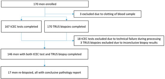 Following the blood draw, 10–12 core TRUS prostate tissue biopsies were performed following international standards. In some cases, a second TRUS biopsy was carried out to verify inconclusive findings of the first biopsy. Researchers and pathologists were blinded towards the tCEC test result as well as tissue biopsy results, respectively.