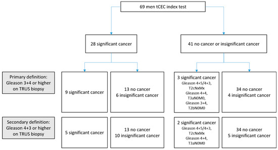 Following the primary definition, only three of 41 men who had a negative tCEC test showed csPCa on TRUS biopsy. One of these had Gleason score 4 + 5/4 + 3 (left/right prostate) and T2cNxMx on clinical staging, the second had Gleason score 4 + 4/4 + 4 and T3aN0M0, and the third showed Gleason score 3 + 4 and T2bN0M0.