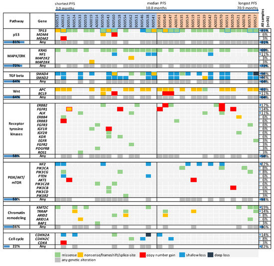 In summary, the analysis of overall genetic alterations in frequently altered genes or the investigated oncogenic pathways failed to identify new promising biomarkers for PFS. However, for the gene TP53, different biological impacts of mutation subtypes may justify a more refined analysis for this gene. In contrast, an alteration subtype analysis did not seem suitable for other genes. KRAS mutations were activating codon 12 or 13 mutations in 23 of 25 patients, APC harbored truncating mutations in 21 of 22 patients, and SMAD2 and SMAD4 were characterized by inactivating mutations or single copy number losses. Alterations in NF2 and KMT2C were restricted to copy number losses and missense mutations, respectively, and ERBB2, FGFR1, TRRAP and CDKN2A were only altered in five to six patients.