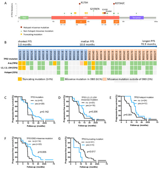 We next analyzed PFS in patients harboring different TP53 mutation subtypes. The median PFS in the overall cohort was 10.0 months (Table 2, Figure 2B). In patients with any TP53 mutation, L2, L3 and LSH mutations or TP53 hotspot mutations, median PFS was longer (11.8, 13.5 and 14.0 months, respectively), however differences to the rest of the cohort were not statistically significant (Table 2 and Figure 2C–E). In contrast, patients with TP53 DBD missense mutations had prolonged PFS compared to patients without such mutations, the median PFS being 13.6 months versus 9.5 months (HR, 0.41; 95% CI, 0.13–0.65; p = 0.005; Table 2 and Figure 2F). PFS did not differ in patients with the most common TP53 DBD missense mutations, R175H and R273C/H (Supplementary Figure S2). In spite of the low number of patients with TP53 truncating mutations, there was a clear association with short PFS compared to patients without TP53 truncating mutations (HR, 2.95; 95% CI, 1.45–27.50; p = 0.017, Table 2 and Figure 2G).