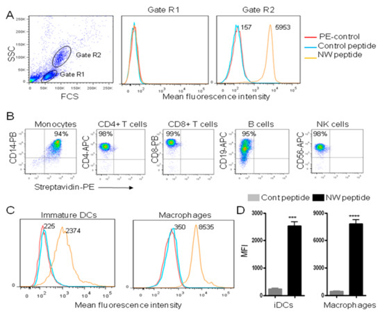 To further evaluate the specificity of the NW peptide towards blood cells, we analyzed its binding to purified CD14+ monocytes, CD4+ T cells, CD8+ T cells, CD19 B cells, and CD56+ NK cells. The cells were co-stained with the biotinylated NW peptide in combination with cell-lineage specific antibodies (Figure 1B). Under our experimental conditions, only monocytes bound to the NW peptides (first panel). This means that the receptor of the NW peptide is not expressed by cells of lymphoid origin. Immature DCs and macrophages also showed a significant binding to the NW peptide (Figure 1C,D). The binding to macrophages and iDCs had 24 (±2) and 11 (±3) -fold increases over those of the control peptide (p < 0.0001 and p < 0.001, respectively). Hence, the receptor of the NW peptide seems to be preferentially expressed by monocytes followed by macrophages, and then iDCs.