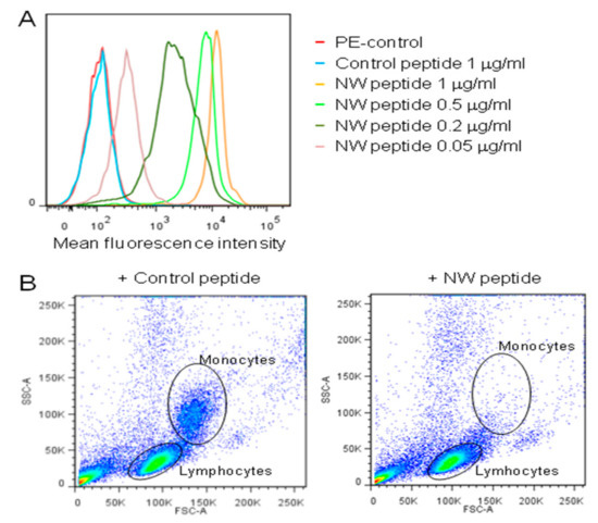 Flow cytometry was performed to analyze the expression of certain surface markers and peptide binding to tested human cells. Conjugated antibodies specific for cell surface markers were incubated with the cells (1–2 × 105 cells/100 μL/sample) in PBS buffer containing 1% FCS or BSA (staining buffer) for 30–60 min at 4 °C. After washing, the cells were re-suspended in 300 μL staining buffer before being analyzed on BD FACS Canto II Flow cytometer, using BD FACSDiva™ software (BD Biosciences, San Jose, CA, USA). Similarly, cells were incubated with biotinylated NW peptide or control peptide (5 μg/mL each) in staining buffer at 4 °C for 40 min. After washing, the cells were incubated with phycoethrin (PE)-conjugated streptavidin, and then processed as indicated above. All data were analyzed by FlowJo software (FlowJo LLC, Ashland, OR, USA).