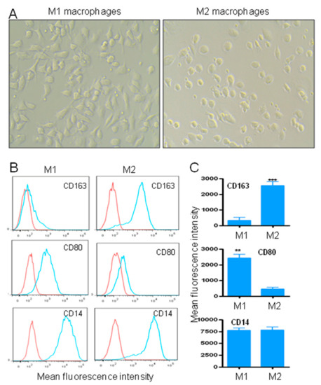 Monocyte-derived M1 and M2 macrophages. (A) Morphology of monocyte-derived M1 or M2 macrophages in X-vivo 15 medium. Original magnification, x20. (B) Phenotypic characterization of M1 and M2 macrophages. Cell surface expression of CD163, CD80 and CD14 markers by M1 and M2 macrophages. (C) Quantitative data from three independent experiments are presented as a mean ± SD. ** p < 0.01, *** p < 0.001.