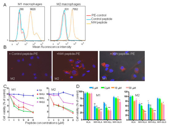 Effects of the fusion lytic peptides on M1 and M2 macrophages. (A) Representative flow cytometry histograms showing the binding of the NW peptide to M1 and M2 macrophages. The numbers indicate the mean fluorescence intensities of the peptide binding. (B) Internalization of the NW-peptide-streptavidin-PE complexes by M2 and M1 macrophages. Biotinylated NW peptide- or control peptide-streptavidin-PE complexes were added to M2 macrophages and incubated for 40 min at 4 °C. After washing, the cells were incubated at 37 °C for 60 min, further washed, fixed, and then confocal microscopy images were taken. Original magnification, x40. The uptake of the NW peptide-PE complexes by M1 is also shown. (C) Cell viability. The cells were incubated with various concentrations of the tested peptides for 60 min at 37 °C, and cell viability was determined using the CellTiter 96R Aqueous One Solution reagent. The results are represented as mean ± SD of triplicate determination. Quantitative data (mean ± SD) from three independent experiments are shown in (D). ** p < 0.01, *** p < 0.001.