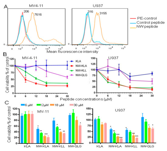 Although many advances have occurred in the treatment of blood malignancies, the treatment of relapsed/refractory acute myeloid leukemia (AML) remains one of the most challenging tasks in oncology today [36,37]. Hence, novel treatment strategies are needed. We first tested the binding of the NW peptide to MV-4-11, a human acute myeloid leukemia cell line, and to U937, a pro-monocytic human myeloid leukemia cell line. As shown in Figure 6A, the NW peptide bound to both cell lines. Cells incubated with the lytic hybrid NW-KLA or the NW-KLL peptide showed significant toxicity when compared to those incubated with free KLA or NW-QLG peptide (Figure 6B). In the case of U937 cells, both NW-KLA and NW-KLL peptides had comparable IC50 values (5–8 µM). MV-4-11 cells seem to be more sensitive to the NW-KLA peptide (IC50 = 4 µM) than the NW-KLL peptide (IC50 =12 µM). Again, the pro-apoptosis QLG domain did not induce killing of leukemia cell lines at lower concentrations (<12 µM). At higher concentrations, the NW-QLG IC50 values for MV4 and U937 were around 60 and 90 µM, respectively.