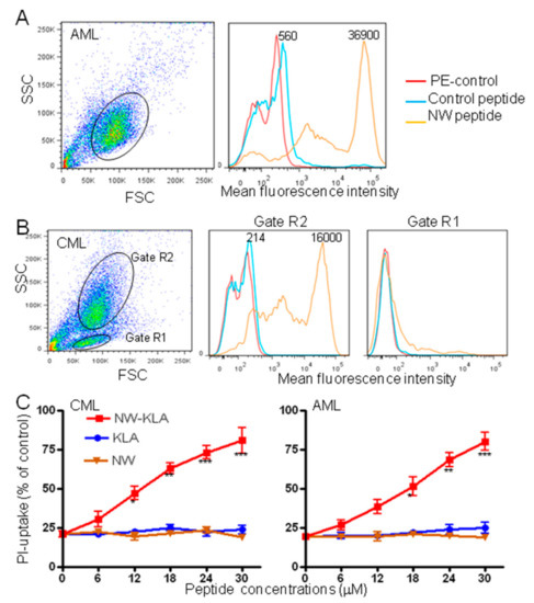 Although the life expectancy of patients with acute myeloid leukemia (AML) or chronic myeloid leukemia (CML) has improved in recent years, treatment resistant and refractory leukemia are still a major problem [36,37]. Hence, novel approaches to treatment are urgently needed to further improve the prognosis of these diseases. Prompted by the strong cytotoxic effects of the engineered lytic hybrid peptides on leukemia cell lines, we investigated next, whether the NW-KLA peptide would kill primary leukemia cells. Figure 8 shows the binding of the NW peptide and control peptide to freshly isolated blood AML (Figure 7A) and CML (Figure 7B) blasts. By contrast to the control peptide, the NW peptide showed a very strong binding to both blast types, indicating that the peptide receptor is overexpressed in primary leukemia cells when compared to leukemia cell lines and macrophages. In the case of the CML, the lymphocyte population (gate R1) did not bind to the NW peptide, again arguing that the peptide binds to a receptor that is expressed by cells of myeloid, but not lymphoid origin. Treatment with the NW-KLA peptide induced cell death in a dose-dependent manner (Figure 8C). When tested at 10 μM for 2 h, the lytic hybrid peptides showed significant cytotoxic effects on blast cells (Figure 9). The average decrease in viability of freshly isolated AML blasts due to the treatment with the NW-KLA and NW-KLL lytic peptides were 88 ± 5% (p < 0.001), 75 ± 6% (p < 0.001), respectively. Similarly, these two lytic peptides induced around 74 ± 7% of cell death in CML blasts (p < 0.001). There was no significant difference in viability between untreated cells and those treated with the control peptides. Comparable results were obtained with additional three patients with AML and four patients with CML.