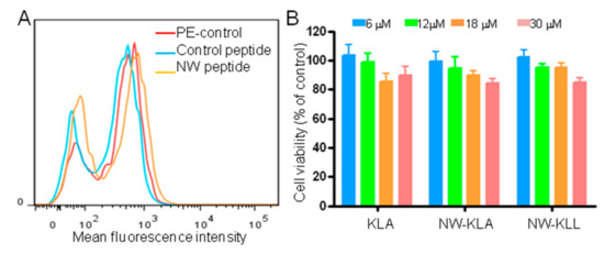 Effects of the fusion lytic peptides on normal mammary epithelial cells. (A) Representative flow cytometry histograms showing the binding of the NW peptide to primary human mammary epithelial cells. (B) Cell viability. The cells were incubated with various concentrations of the tested peptides for 60 min at 37 °C and cell viability was determined using the CellTiter 96R Aqueous One Solution reagent. The results are represented as mean ± SD of three independent experiments.
