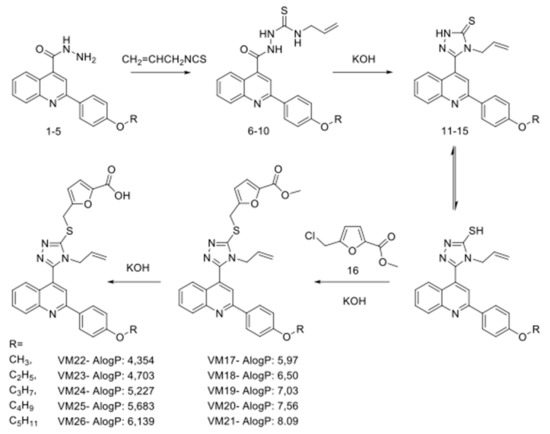 The starting materials for synthesis were hydrazides of 2-(4-alkoxyphenyl)quinolin-4-carboxylic acids (1–5) [28], which were delivered in conjunction with allyl isothiocyanate in ethanol, resulting in the synthesis of N4-allylthiosemicarbazide 2-(4-alkoxyphenyl)quinolin-4-carboxylic acids (6–10). These compounds were further cyclized with KOH into 4-allyl-3-[2-(4-alkoxyphenyl)quinoline-4-yl]-4,5-dihydro-1H-1,2,4-triazole-5-thiones (11–15) [29]. The reaction of compounds 11–15 with the methyl ester of 5-chloromethylfuran-2-carboxylic acid in the presence of equimolar amounts of KOH yielded only S-substituted derivatives (VM17-VM21). In the latter structures, the ester group was hydrolyzed with potassium hydroxide in water-methanol medium to a carboxyl group (VM22-VM26).