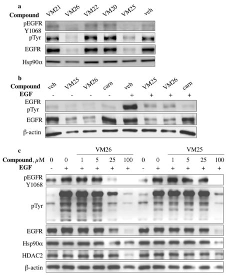 A comparative evaluation of the two active compounds showed that the phosphorylation levels at Tyr1068 and EGFR expression decreased in a dose-dependent manner in serum-starved MDA-MB-468 cells treated with the compounds and then stimulated with EGF (Figure 2c). The cells also gradually suppressed the tyrosine phosphorylation of other protein kinases, as detected with the anti-pTyr antibody, and compound VM26 was more active than VM25. Compound VM26 was also active in non-small-cell lung-cancer (NSCLC) A549 cells (Supplementary Figure S1). Notably, the decrease in EGFR levels was accompanied by a decrease in the levels of other proteins, such as Hsp90α, HDAC2, and β-actin, in cells treated with higher concentrations of the compounds (Figure 2c and Supplementary Figure S1).