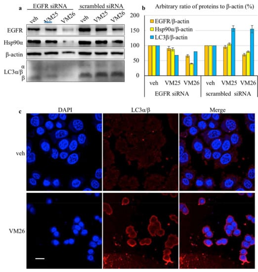 MDA-MB-468 cells were transfected with EGFR-specific siRNA and used to assess the protein levels after exposure to the small compounds. Despite the moderate efficacy of siRNA silencing (apparently related to the high copy number of EGFR in the MDA-MB-468 cell line), the cells displayed a remarkable decrease in EGFR and Hsp90α levels and less in β-actin levels when exposed to compound VM26 (this decrease was less apparent with compound VM25) in serum-deprived culture compared with the vehicle (Figure 3a). In this assay, we also assessed the ubiquitin-like proteins LC3α/β by taking into consideration that LC3β accumulation correlates with increasing numbers of autophagosomes and therefore, it can be used for monitoring autophagy [31]. A relatively intense 16-kDa band corresponding to LC3β was detected in the cells, indicating the activation of EGFR endocytosis. The shift of LC3α to LC3β was more pronounced with scrambled siRNA than with EGFR-specific siRNA in cells treated with small compounds, suggesting that knockdown of the receptor reduced the autophagy response. The quantification of the ratio of LC3β to β-actin showed that the relative levels of the autophagy biomarker were higher by approximately 50% after exposure to the compounds VM25 or VM26 in cells transfected with scrambled siRNA compared with the vehicle (Figure 3b). Hence, compounds VM25 or VM26 could induce the degradation of EGFR and associated nutrient-prone proteins in cancer cells during growth in the serum-deprived medium.