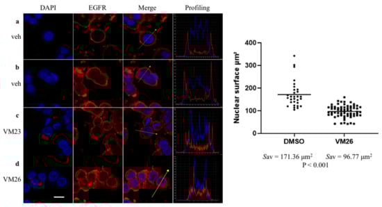 Next, immunofluorescence imaging confirmed that small compounds specifically target EGFR in starved cancer cells. In control experiments with the vehicle, the receptor was found exclusively in the cytoplasmic membrane of nonpermeabilized cells or predominantly in the cytoplasmic membrane of permeabilized cells (Figure 4a,b and Supplementary Figure S3a,b). In contrast, after a short exposure to low concentrations of VM23 or VM26, the fluorescence signal emitted by EGFR decreased in the cytoplasmic membrane and increased in the cytoplasm (Figure 4c,d and Supplementary Figure S3c,d). Moreover, the second fluorescent area illuminated around nuclei was identified as two new peaks on signal profiling curves (to the right in the images). The dispersion of fluorescence signals in the cytoplasm, as well as alternating low peaks on profiling curves, indicated that a portion of EGFR is released in this compartment. Notably, these features were associated with the reduction of the size of cells and nuclei upon exposure to the compounds. The measurement of the two-dimensional axis of nuclei showed a statistically significant decrease in their size and surface square after exposure to VM26 compared with the vehicle (Figure 4e and Supplementary Table S1). This morphological change strongly suggested that exposure to small compounds rapidly results in the diminution of the cell contacting surface with the plate surface, which in the biological sense indicates the loss of the adhesion capacity of cells to the ECM.