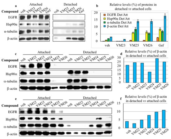 To compare the ability of five compounds, VM22-VM26, to detach the cells, the treatment in serum-deprived medium was prolonged for 48 h. The cells treated with VM22, VM23 or vehicle displayed similar profiles of EGFR, Hsp90α, α-tubulin and β-actin in the attached cells, and except EGFR, the three other proteins were detected in the detached cells (Figure 5c). In contrast, the cells treated with VM25 or VM26 displayed almost no EGFR, Hsp90α, and α-tubulin and significant decrease in β-actin levels in the attached cells. Moreover, none of the first three proteins was detected in the detached cells as an indication of cancer cell death.