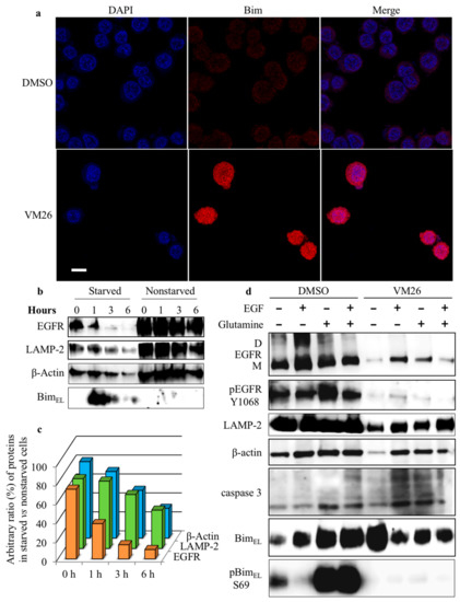 This observation was verified by studying the kinetics of Bim expression and phosphorylation in 12-h FBS-deprived cultures incubated further with 25 µM VM26 for 6 h in FBS-deprived and nondeprived media. The MDA-MB-468 cells treated in FBS-deprived medium displayed essentially increased BimEL expression after one-hour exposure to the compound, but the protein level decreased after a longer, three-hour exposure (Figure 6b). Notably, high levels of BimEL were associated with an essential decrease in the abundance of EGFR after one-hour exposure to VM26. The expression of the lysosomal protease LAMP-2 and the cytoskeletal protein β-actin declined later compared with EGFR in the starved culture. In parallel series of experiments with nonstarved MDA-MB-468 cultures, the BimEL level was low and the decrease in the levels of other proteins could be observed after a longer, six-hour incubation with VM26.