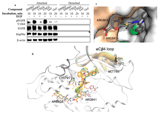 We examined whether the suppression of EGFR phosphorylation resulted from only the protein degradation or whether the small compound also inhibited the tyrosine kinase site. MDA-MB-468 cells grown in serum-deprived medium were incubated with the most active compound, VM26, for short time periods, 10 and 20 min, and then, EGFR phosphorylation was stimulated by the incubation of the cells with EGF for 5 min. The decrease in tyrosine phosphorylation at Tyr1068 was detected only after 10-min exposure to VM26, whereas gefitinib, used as reference TKI, strongly inhibited EGFR phosphorylation at both 10-min and 20-min exposure times (Figure 7a). Therefore, the ability of VM26 to transiently prevent tyrosine phosphorylation of EGFR by the cognate ligand EGF characterizes the compound as a reversible and weak ATP competitor that shows inhibitory potency only within a short time.