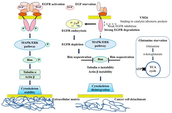The proposed mechanism of the action of EGFR degraders on cancer cells. The binding of EGF to the extracellular region of the receptor monomers results in rearrangements favorable to the formation of functionally active homodimers that trigger downstream signaling pathways [1]. The compound VM26 binds to the tyrosine kinase catalytic pocket extended into the hydrophobic allosteric site inducing EGFR trafficking and degradation in endosomes (microautophagy). The depletion of EGFR results in Bim sequestration that leads to cytoskeleton disintegration, and ultimately to cancer cell detachment from the extracellular matrix. Glutamine starvation causes the deficiency of α-ketoglutarate and thereby, the inability of cells to replenish the tricarboxylic acid (TCA) cycle and produce ATP. Dual starvation for EGF and glutamine accelerates and reinforces the cytoskeleton disintegration leading ultimately to cancer cell detachment-promoted death.
