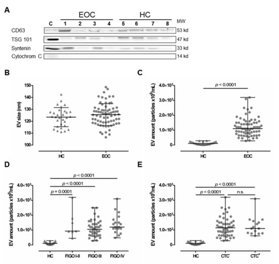 2.1. Characterization of Extracellular Vesicles in Plasma of EOC Patients and Healthy Controls
