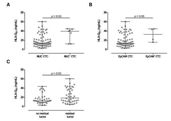 - Konig, L.; Kasimir-Bauer, S.; Hoffmann, O.; Bittner, A.K.; Wagner, B.; Manvailer, L.F.; Schramm, S.; Bankfalvi, A.; Giebel, B.; Kimmig, R.; et al. The prognostic impact of soluble and vesicular HLA-G and its relationship to circulating tumor cells in neoadjuvant treated breast cancer patients. Hum. Immunol. 2016, 77, 791–799. [Google Scholar] [CrossRef] [PubMed]