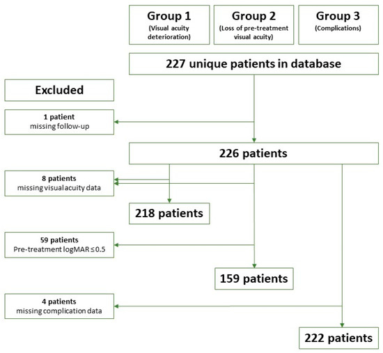 We performed two visual acuity analyses: the first including the full cohort (group 1), and the second including solely patients with a pre-treatment visual acuity ≤0.5 logMAR (logarithm of minimum angle of resolution) (the limit for public blindness and the minimum driving license requirement, group 2).