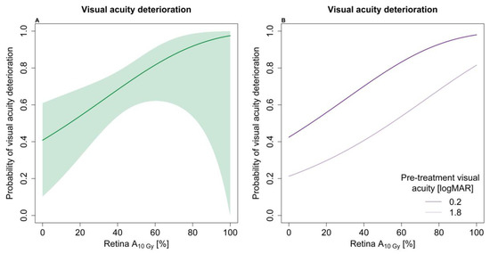 (A) Dose–response of visual acuity deterioration as a function of the area of the retina receiving 10 Gy (retina A10Gy). The model adjusts for optic disc–tumour distance (2.4 mm), pre-treatment visual acuity (0.3 logMAR), macula V20Gy (89%), and macula A80Gy (8%). The shaded area indicates the 95% confidence intervals. (B) Dose–response of visual acuity deterioration as a function of retina A10Gy for two pre-treatment visual acuity measures (0.2 and 1.8 logMAR); all the other factors were kept as for Figure 2A.