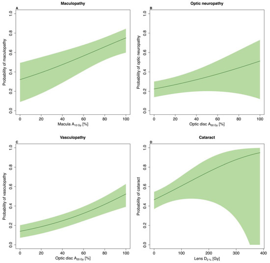 (A) Dose–response of maculopathy as a function of the area of macula receiving 10 Gy (macula A10Gy). The model adjusts for optic disc–tumour distance (2.4 mm). (B) Dose–response of optic neuropathy as a function of optic disc A50Gy. The model adjusts for optic disc–tumour distance and optic disc A50Gy (39.4 Gy). (C) Dose–response of vasculopathy as a function of optic disc A20Gy. (D) Dose–response of cataract as a function of lens D2%. The model adjusts for age at treatment (62 years) and largest base dimension (11.3 mm). The shaded areas represent the 95% confidence interval of the risk estimates.