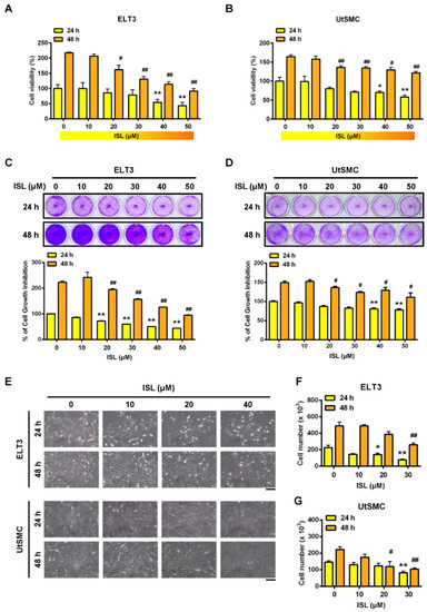 Initially, to evaluate whether ISL has the ability to inhibit cell proliferation in uterine leiomyoma ELT3 and UtSMC cells were treated with serial doses of ISL (10, 20, 30, 40, and 50 μM) for 24 and 48 h. The results showed that treatment of ELT3 cells with ISL at a concentration above 40 μM for 24 h inhibited cell proliferation. When ELT3 cells were treated for 48 h, ELT3 cell proliferation was significantly reduced in the presence of ISL at 20 to 50 μM (Figure 1A). In contrast, treatment of UtSMC cells with ISL for 24 and 48 h had a slight inhibitory effect on cell proliferation, even in the presence of ISL at concentrations higher than 40 μM (Figure 1B). The results of the crystal violet assay aligned with those of the MTT assay were as follows: The inhibitory effect of ISL was observed in both ELT3 and UtSMC cells (Figure 1C,D). In the presence of ISL at 40 μM, a significantly reduced cell number and shrinking, scrawny, and rounded floating cell morphologies were observed in ELT3 cells (Figure 1E, upper panel, and Figure 1F). In addition, a flattened and very slim cell morphology was observed in UtSMC cells (Figure 1E, lower panel). The number of UtSMC cells also slightly reduced by ISL treatment (Figure 1G). These results suggested that ISL presents a potential role in the suppression of uterine leiomyoma growth.