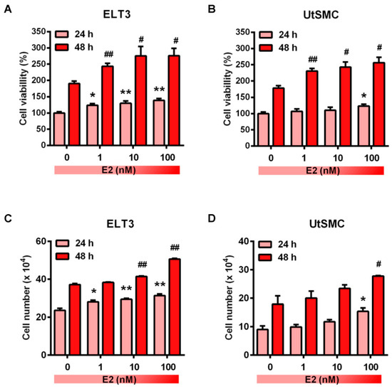 Effects of estradiol on the growth of ELT3 and UtSMC cells. (A,B) Both ELT3 and UtSMC cells were seeded at 3000 cells per well in 96-well plates. Cells were treated with E2 in serial concentrations for 24 and 48 h. Cell viability was analyzed using the MTT assay (n = 4). (C,D) ELT3 (6 × 104 cells per well) and UtSMC (1.5 × 105 cells per well) cells were seeded in 6-well plates. Cells were treated with serial concentrations of E2 for 24 and 48 h. Cell numbers were counted using trypan blue stain (n = 3). Data are represented as means ± SEM. * p < 0.05, ** p < 0.01 compared with the 24 h-control group. # p < 0.05, ## p < 0.01 compared with the 48 h-control group.