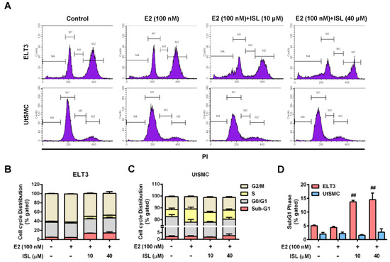 The ELT3 and UtSMC cells were seeded in 2.5 × 105 and 3 × 105 cells in 6-cm culture dishes, respectively. After attaching overnight, cells were rendered quiescence in DMEM/F-12 medium supplemented with 0.4% charcoal-stripped FBS for 24 h, and then treated with estradiol (E2; 100 nM) alone or co-treated with E2 (100 nM) and ISL (10 or 40 μM) in DMEM/F-12 medium containing 10% charcoal-stripped FBS for an additional 48 h. At the end of incubation, the cells were detached by trypsinization and collected together with culture media into 15 mL tubes. After centrifugation, the supernatant was removed, and the cell pellets were resuspended in 1 mL 1× PBS and then mixed with 70% ethanol at −20 °C for at least 2 h. Next, the cell pellets were centrifuged and resuspended in propidium iodide (PI) mixture solution (2 mg DNAse-free RNAse A and 0.4 mL of 500 μg/mL PI was added to 10 mL of 0.1% Triton X-100 in PBS) at room temperature for 30 min. The density of fluorescence in cell samples was analyzed using BD FACSCalibur flow cytometer (BD Biosciences, San Jose, CA, USA).