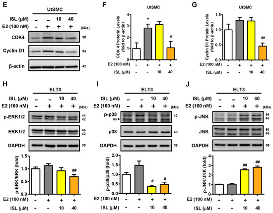 To confirm whether ISL-induced cell proliferation suppression occurs through regulated cell cycle progression, the cells were stained with PI and analyzed using flow cytometry. The results showed that cell cycle progression in ELT3 cells treated with E2 alone was not affected. However, ELT3 cells co-treated with E2 and an ISL concentration of 10 and 40 μM decreased G2/M phases distribution (Figure 4A,B). In contrast, treatment of E2 significantly increased S phase distribution in UtSMC cells. This increased effect was reduced by co-treatment with E2 and ISL (Figure 4A,C). The distribution of the sub-G1 phase increased with co-treatment with E2 and ISL, but this effect was not observed in UtSMC cells (Figure 4D). We further examined whether the expression of cyclin/CDK complex involved in suppression of cell cycle at S-phase by treatment with ISL in UtSMC cells and the expression of cyclin D1/CDK4 complex in UtSMC cells was monitored. The results showed that treatment with E2 increased cyclin D1 expression, but the expression of cyclin D1 and CDK4 protein level were decreased by co-treatment with E2 and ISL at 40 μM for 48 h in UtSMC cells (Figure 4E–G). It has been reported that the mitogen-activated protein kinase (MAPK) pathway is important in cell survival and apoptosis regulation [46]. We further analyzed the expression of MAPK proteins using Western blot. The results showed that co-treatment of cells with E2 and ISL concentration of 10 and 40 μM reduced the expression of phosphorylated extracellular signal-regulated kinase-1 and -2 (ERK1/2) protein (Figure 4H), whereas the expressions of phosphorylated p38 and c-Jun N-terminal kinase (JNK) proteins were increased (Figure 4I,J). Additionally, Hoechst 33342 staining was performed for observation of DNA condensation. The results showed that treatment with E2 alone did not produce any alterations in ELT3 cells; however, co-treatment with E2 and ISL markedly increased the population of DNA-condensed cells, confirmed by the observation of higher strength blue fluorescence. In contrast, we observed no alteration in nuclear stains in UtSMC cells after co-treatment with E2 and ISL (Figure S1).