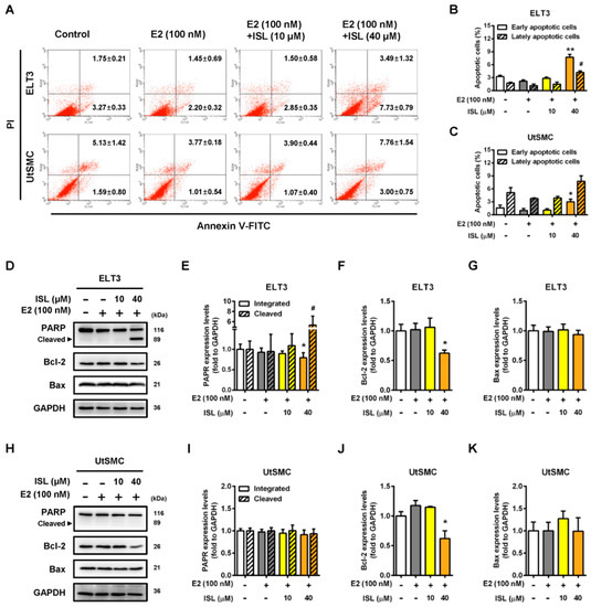 To further confirm whether ISL induced cell apoptosis in ELT3 and UtSMC cells, the cells were double stained with PI and Annexin V-FITC, and the apoptotic cell percentage was analyzed by flow cytometry. The results showed that the percentages of annexin-V-positive in ELT3 cells, indicating early apoptotic status, and PI- and Annexin-V-positive, indicating early apoptotic status, increased by co-treatment with E2 and an ISL concentration of 40 μM compared with the E2 alone treatment group (Figure 5A,B). In contrast, UtSMC cells co-treated with E2 and ISL at 40 μM increased the Annexin-V-positive cell population, but the PI- and Annexin-V-positive cell populations did not change (Figure 5A,C). The apoptosis-associated proteins levels were analyzed by Western blot. We found that co-treatment with E2 and ISL at 40 μM for 48 h decreased the expression levels of total PARP protein in ELT3 cells. Moreover, the expression level of cleaved PARP protein increased by co-treatment with E2 and ISL at 40 μM. The expression level of Bcl-2 protein was lower in ELT3 cells by co-treatment with E2 and ISL, but the Bax protein expression level was not altered (Figure 5D–G). The expression level of Bcl-2 in UtSMC cells was observed to be parallel with ELT3 cells co-treated with E2 and ISL at 40 μM. However, PARP and Bax protein levels were not altered by co-treatment with E2 and ISL in UtSMC cells (Figure 5H–K).