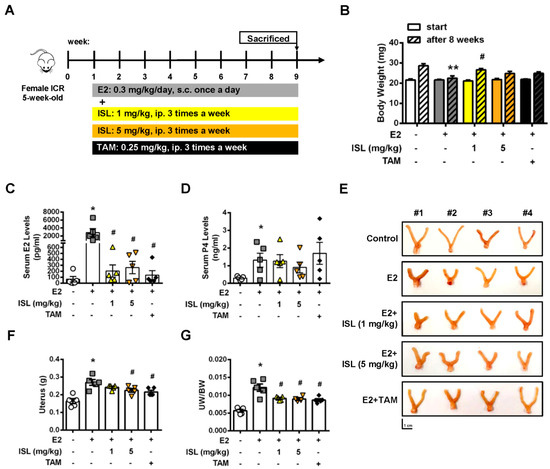 The process of mouse uterine hyperplasia animal model generation is illustrated as Figure 7A. After adaption for 1 week, mice were randomly divided into five groups: (i) mice were administered with DMSO via subcutaneous injection as vehicle control group once daily for 8 weeks; (ii) mice were treated with E2 (0.3 mg/kg/day) via subcutaneous injection once daily for 8 weeks as the model control group; mice were subcutaneous injected with E2 (0.3 mg/kg/day) combined with ISL at low concentration (1 mg/kg/day, ip injection) (iii) or high concentration (5 mg/kg/Day, ip injection) (iv) three times a week for 8 weeks; and (v) the positive group was generated by co-treatment of mice with E2 (0.3 mg/kg/day, subcutaneous injection) and tamoxifen (TAM; 0.25 mg/kg/day, ip injection) for three times a week for 8 weeks.