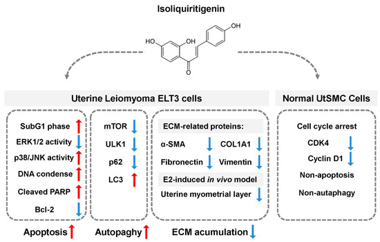 Flavonoids are widely present in plant-based food, nutraceuticals, and traditional Chinese medicine (TCM). They are one of the biologic compound groups in licorice and are known to have strong anticancer activities. Among the flavonoids, quercetin and liquiritin have been shown to exert variable biologic activities, and also showed an inhibitory activity on the growth of various cancer cells via inducing apoptosis progression [50,51,52]. ISL also has anticancer growth activity. Previously, we reported that ISL treatment could inhibit gynecologic cancers’ progression, including breast, ovary, uterine sarcoma, and endometrial cancers [35,36,37,38]. In this study, we uncovered a completely novel role of ISL in anti-proliferation of uterine leiomyoma. We found that ISL treatment could inhibit uterine leiomyoma ELT3 cell growth by arresting the cell cycle and inducing cell apoptosis and autophagy progression. However, normal primary human uterine smooth muscle (UtSMC) cell growth was suppressed by ISL treatment at a higher concentration by reducing the cell cycle in the S phase, but cells did not undergo further apoptosis or autophagy in the cell death program. These results suggest that ISL exerts a highly selective and specific anticancer activity on the uterine leiomyoma.
