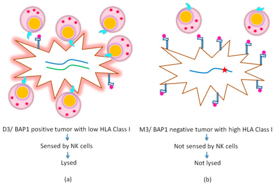 Schematic illustration of the relationship between the tumor’s chromosome 3/BRCA-Associated Protein 1 (BAP1) status, its HLA expression and Natural Killer (NK) cell recognition. (a) Disomy 3/BAP1-wildtype tumor: low HLA Class I expression, killed by NK cells. (b) Monosomy 3/BAP1-mutated tumor: high HLA Class I expression, escapes from NK cell-mediated lysis in the bloodstream.
