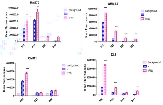 During the last decades, several studies have confirmed that UM cells may lack expression of locus or allele-specific HLA antigens, which may help cells to escape from T cell-mediated responses while the normal expression of the remaining antigens would give the cells the ability to be protected against NK cells inside the bloodstream. In 2002, Anastassiou et al. [34] studied HLA-A, HLA-B, and HLA-C expression using immunoprecipitation and Western blot on tissues of 18 HLA-typed patients. Half of the samples showed full HLA-A and HLA-B expression, while HLA allotype loss was found in 33%, with three cases affecting the HLA-A locus (HLA-A2, A28, and A29) and three the HLA-B locus (HLA-B18, B35 and B55). Two tumors showed a haplotype loss (HLA-A2, B44 and HLA-A2, B13) and one tumor showed a complete HLA-A (HLA-A26, -A32) loss together with one HLA-B allotype loss (HLA-B41). HLA-A2 expression was variable, with homogenous expression in three samples (>75% of the tumor cells), heterogeneous expression in two samples (25–75% of the tumor cells) and negative expression in only one sample. The cause for lack of expression was not investigated. In order to find out whether immunotherapy would be feasible on UM, our lab studied the reason why specific T cells would not recognize tumor cells in spite of high levels of HLA Class I expression in UM [35]. It was suggested that there might be an association between loss of specific HLA haplotypes and T cell recognition. A series of molecularly HLA-typed cell lines (92.1, Mel202, OCM-1, EOM3, OCM-3 and OMM1) was tested using Fluorescence-Activated Cell Sorting (FACS) in order to find defects in polymorphic HLA-A and HLA-B expression. HLA-A expression was high in all the tested cell lines and could be further (and similarly) induced by both IFNγ and IFNα treatment [36,37]. Both allele-specific and locus-specific loss of HLA expression were observed in UM cell lines, and some could be restored by IFN treatment, others could not. Cell line 92.1 had lost HLA-B44, and Mel202 had lost its HLA-B5-allele specific expression while OMM1 had lost all B locus-specific expression (HLA-B27, -B40). This loss of expression may have helped the tumor to prevent recognition by CTLs, helping metastasis to develop [16]. Recently, we tested four UM cell lines and used IFNγ to induce HLA Class I expression (Figure 2).