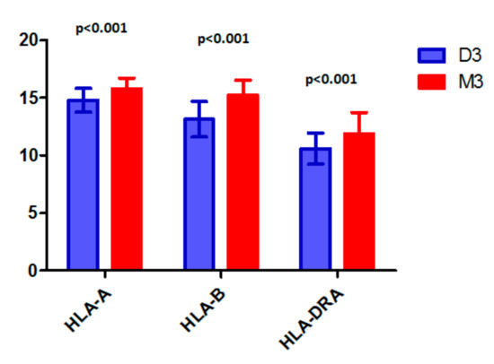 Comparison between HLA-A, HLA-B and HLA-DR expression in disomy 3 (D3) vs monosomy 3 (M3) tumors of The Cancer Genome Atlas (TCGA) database.