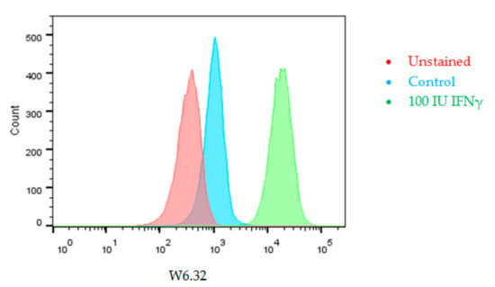 Interferon gamma (IFNγ) treatment induces HLA Class I expression, determined with monoclonal antibody W6/32 and Fluorescence-Activated Cell Sorting (FACS) analysis on Uveal melanoma (UM) cell line 92.1, after 48 h treatment.