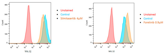 Treatment of cell line OMM2.5 with two different kinase inhibitors for 48 h either reduced (silmitasertib) or increased (foretinib) HLA Class I expression (monoclonal antibody W6/32, measured by Fluorescence-Activated Cell Sorting (FACS) analysis). In the control, no drug was added.