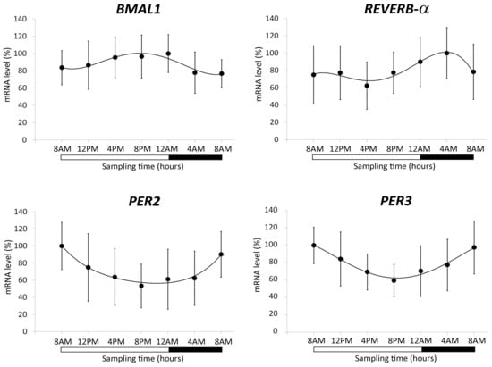 Expression profiles of clock genes (BMAL1, REVERB-α, PER2, and PER3) in lymphocytes of 15 volunteers. The mRNA levels (mean ± SD) are expressed as relative % values compared with the acrophase set at 100%. The black region of the bar indicates the rest period at night.