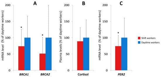 BRCA1 and BRCA2 values (A), cortisol (B), and PER2 gene expression levels (C) in shift and daytime workers. Results (mean ± SD) are expressed as % of values of daytime workers. * = p < 0.05, Student’s t-Test for independent samples. Blood sampled in the morning after a day off from work.