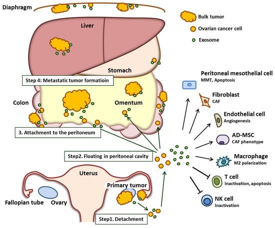 Overview of the role of the ovarian cancer-derived exosome in peritoneal dissemination. Exosomes secreted by the ovarian cancer cell promote each step of peritoneal dissemination by mediating the interaction between the cancer cell and the components of the tumor microenvironment. The stimulated tumor microenvironment supports cancer progression. Abbreviations: MMT; mesothelial–mesenchymal transition, CAF; cancer-associated fibroblast, AD-MSC; adipose tissue-derived mesenchymal stem cell; NK; natural killer.