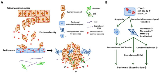 Exosome-mediated reprogramming of peritoneal mesothelial cells (PMCs) promotes the dissemination of ovarian cancer. (A) Schematic modeling of early metastasis to the peritoneum. Ovarian cancer-derived exosomes are transferred into PMCs and reprogram PMCs. Exosome-stimulated PMCs undergo mesothelial–mesenchymal transition and then induce the degradation of ECM and upregulate cell adhesion molecules. The exosome also induces the apoptosis of PMCs. MMT and the apoptosis of PMCs destroy the PMC barrier of the peritoneal surface. Cancer-derived exosomes also reprogram the fibroblast into CAFs. (B) Proposed mechanism of the reprogramming of PMC by ovarian cancer-secreted exosome (see text for details).