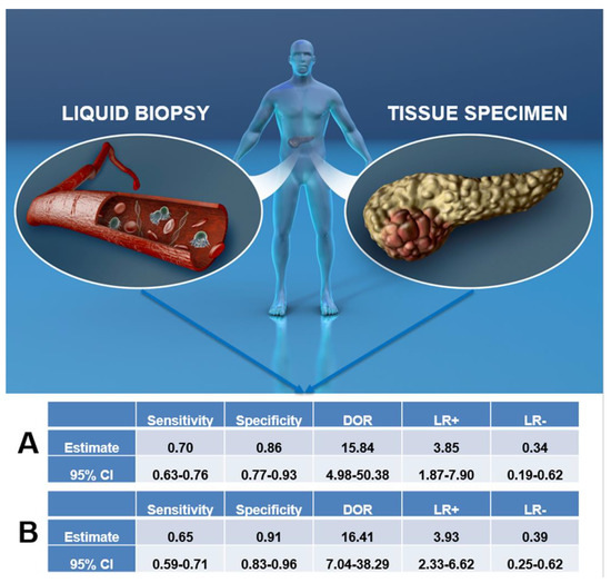 This figure represents the core of this meta-analysis, in which we tested the reliability of liquid biopsy to serve as surrogate for tissue for molecular profiling of pancreatic cancer. The upper panel is a schematic representation of the differences between the materials used for liquid biopsy (above all from the blood, on the left) and for tissue specimen analysis (surgical resections or cytology, on the right). The section indicated with letter A shows the overall summary of diagnostic accuracy parameters for liquid biopsy compared to tissue specimen with this meta-analysis, whereas the section with letter B shows the same parameters, but obtained analyzing data regarding KRAS only. Abbreviations: CI: confidence interval; DOR: diagnostic odds ratio; LR+: positive likelihood ratio, LR−: negative likelihood ratio.
