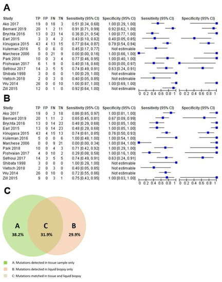 (A) shows the sensitivity and specificity meta-analysis plot for the appropriateness of liquid biopsy compared to tissue specimen, whereas (B) shows the same plot, but obtained analyzing data regarding KRAS mutational status only. (C) is a Venn diagram showing, for studies based on next-generation sequencing, the concordance rate of all mutations detected by the analysis on tissue specimens and by the analysis on liquid biopsy. The area on the left (green area) indicates mutations detected only in tissue samples, the area on the right (red area) indicates mutations detected only in liquid biopsy, whereas the middle area indicates mutations detected in both tissue samples and liquid biopsy.