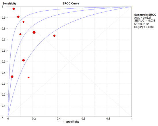 Summary Receiver Operating Curve (SROC) of the appropriateness liquid biopsy, taking tissue specimen as the outcome. In this figure, the blue lines represent the AUC (central line) with its 95% CI (external lines) calculated with a meta-analytic approach, while red dots represent the sensitivity and specificity data for each study.