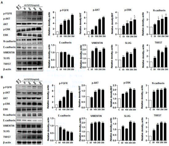 2.7. FGF21 Activates Epithelial–Mesenchymal Transition (EMT) Signaling and Upregulates FGFR Signaling